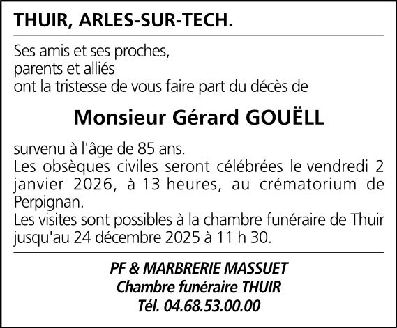 Décédé à Montbolo (66110) le vendredi 19 décembre 2025 à l'âge de 85 ans