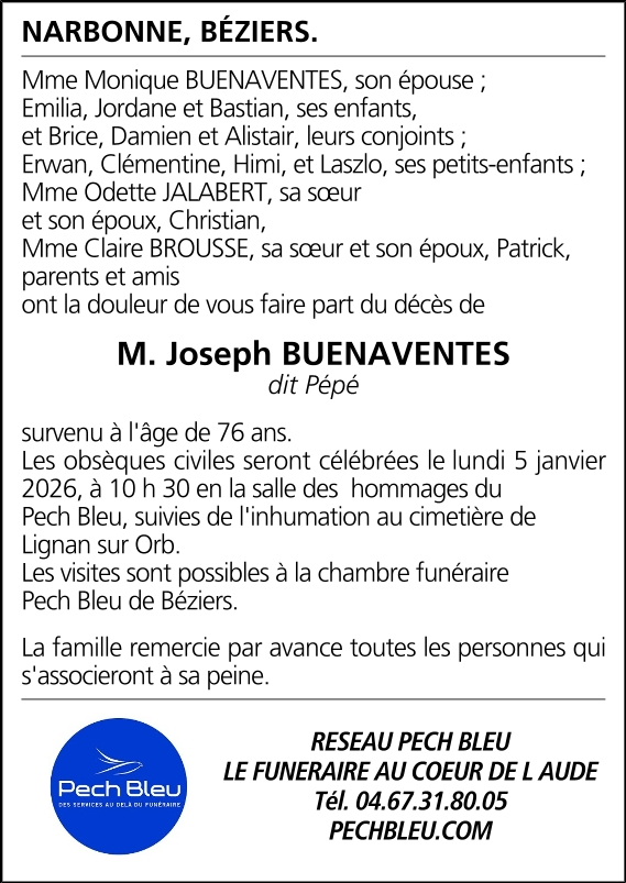 Décédé à Narbonne (11100) le dimanche 28 décembre 2025 à l'âge de 76 ans