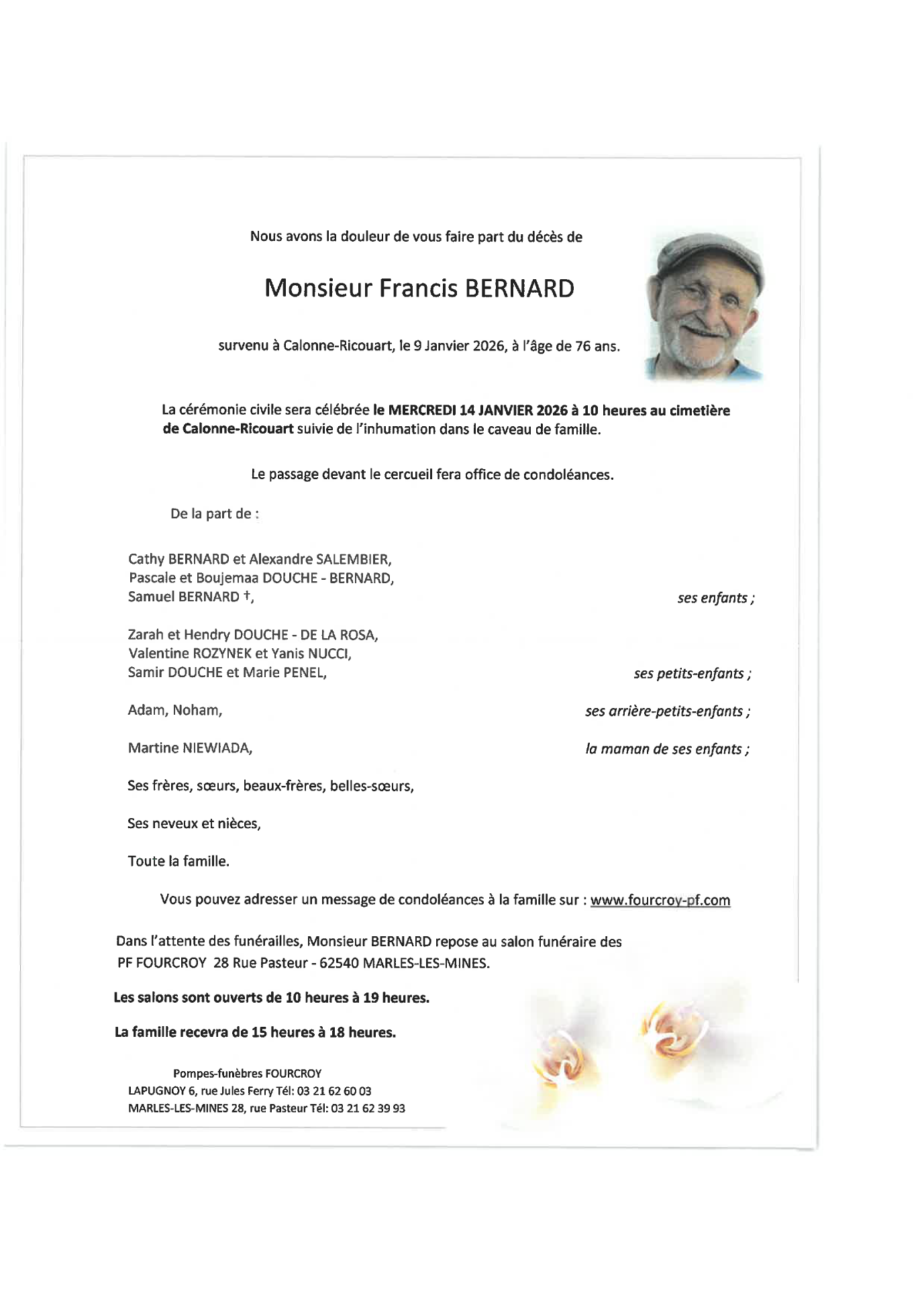 Décédé à Calonne-Ricouart (62470) le vendredi 9 janvier 2026 à l'âge de 76 ans
