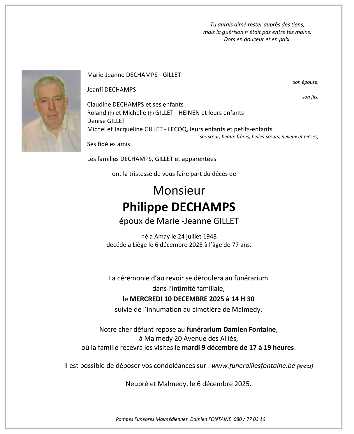 Décédé à Liège (4000, Belgique) le samedi 6 décembre 2025 à l'âge de 77 ans