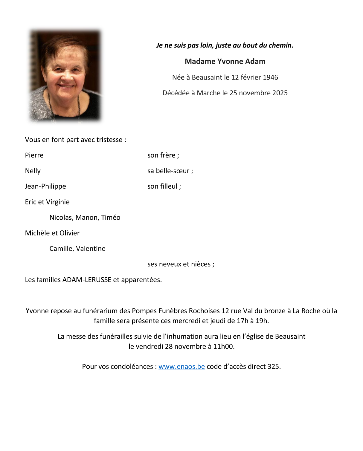 Décédée à Marche-en-Famenne (6900, Belgique) le mardi 25 novembre 2025 à l'âge de 79 ans