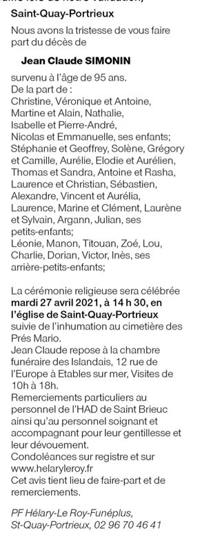 Décédé à Saint-Quay-Portrieux (22410) le jeudi 22 avril 2021 à l'âge de 95 ans