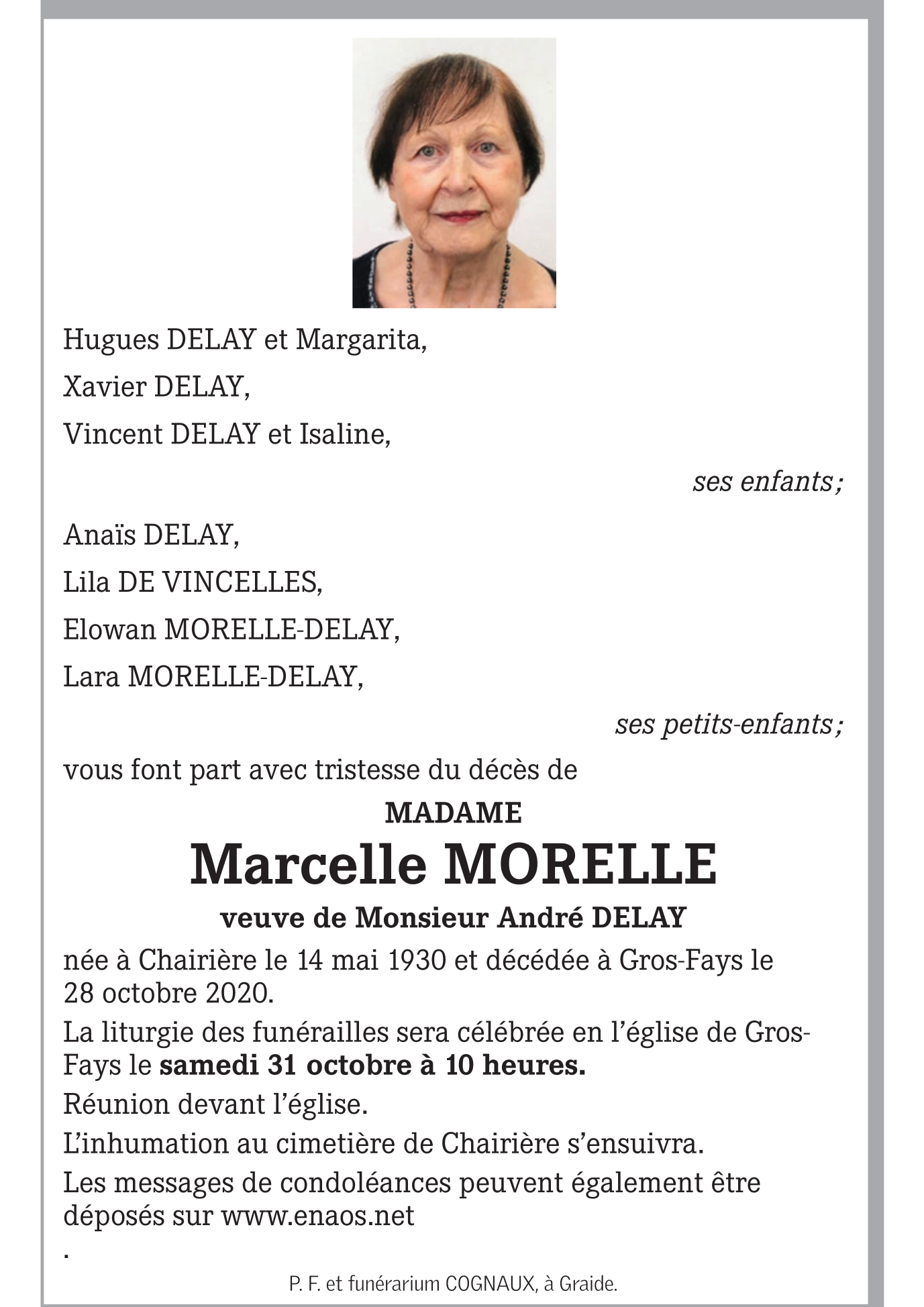 Fallecida en Gros-Fays (5555, Bélgica) el miércoles, 28 de octubre de 2020 a la edad de 90 años