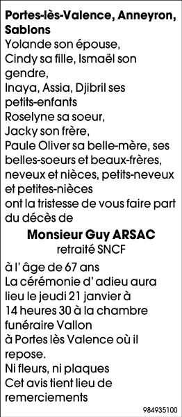 Décédé à Valence (26000) le samedi 16 janvier 2021 à l'âge de 67 ans