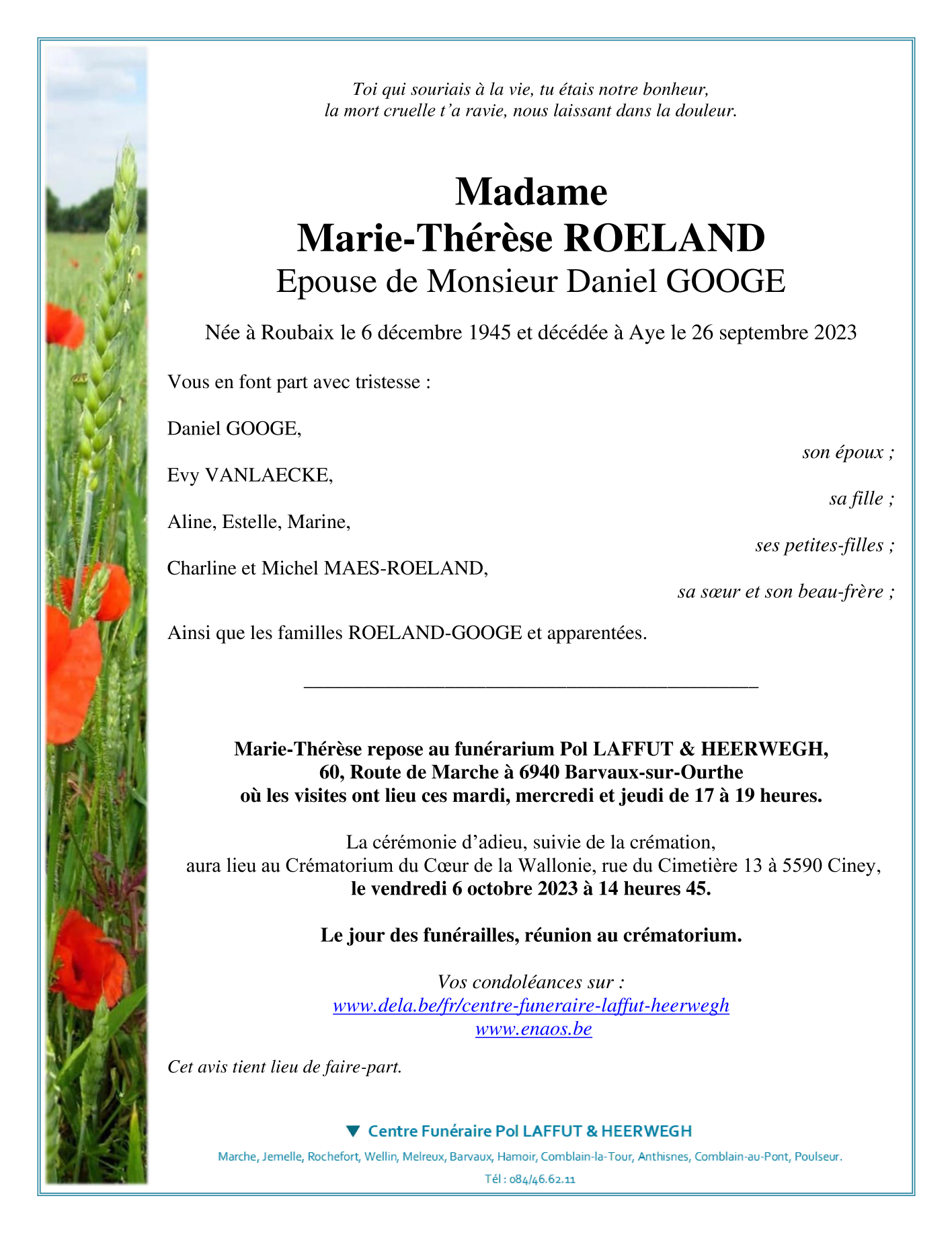 Fallecida en Aye (6900, Bélgica) el martes, 26 de septiembre de 2023 a la edad de 77 años