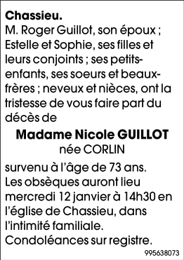 Décédée à Crest (26400) le jeudi 6 janvier 2022 à l'âge de 73 ans
