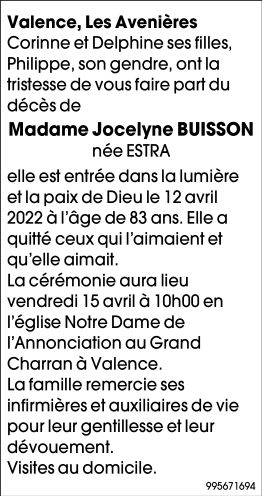 Fallecida en Valence (26000) el martes, 12 de abril de 2022 a la edad de 83 años