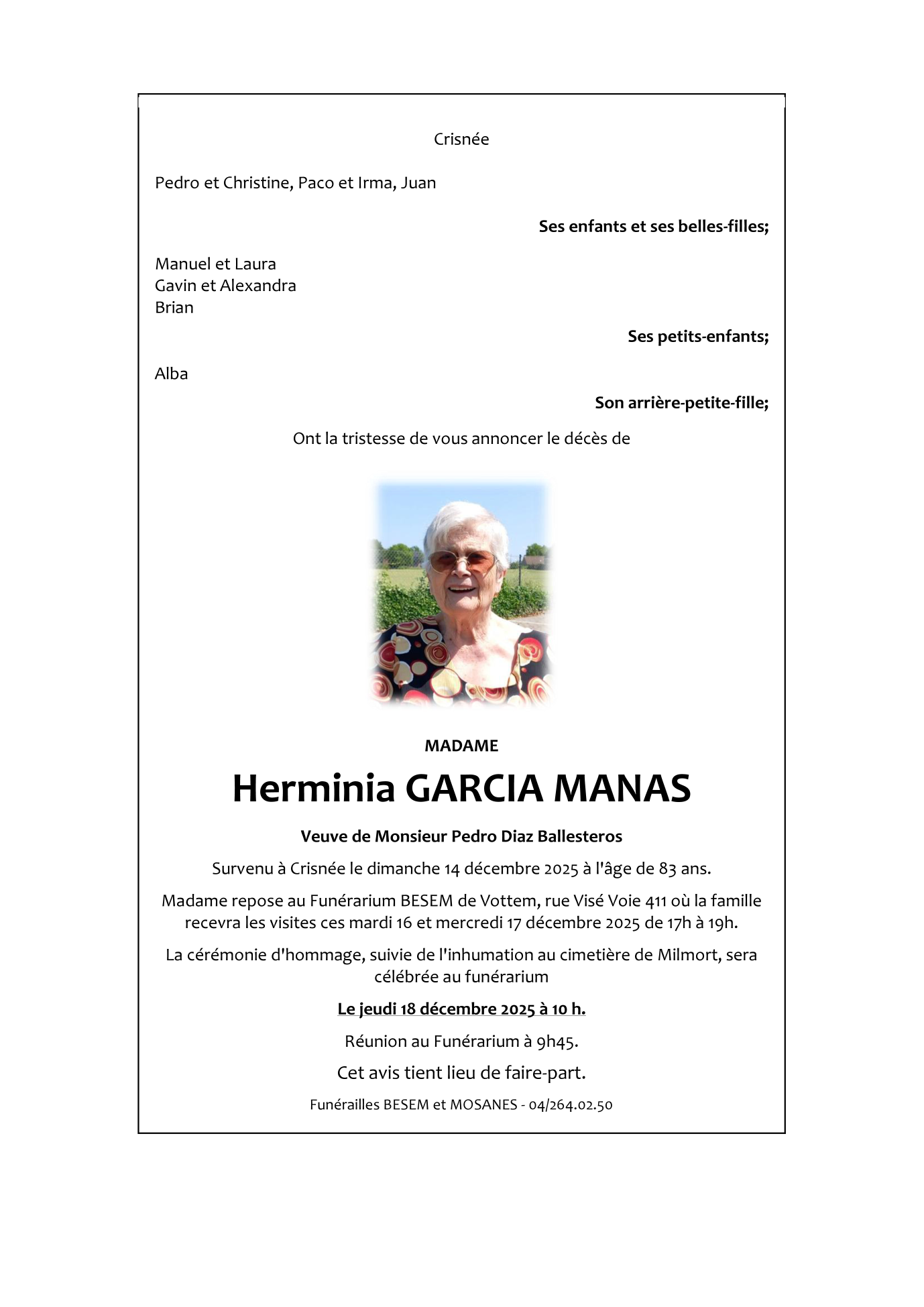 Décédée à Crisnée (4367, Belgique) le dimanche 14 décembre 2025 à l'âge de 83 ans