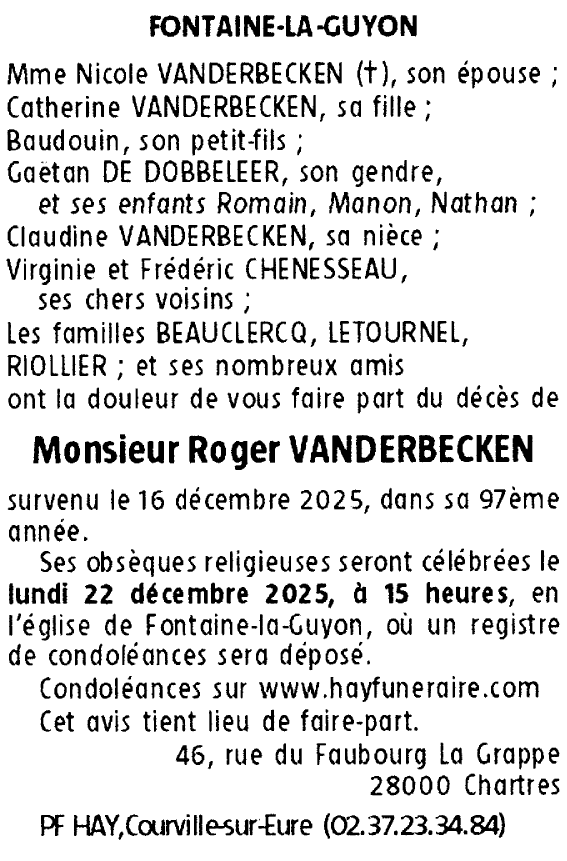 Died in Le Coudray (28630) on 16 December 2025 at the age of 96 years