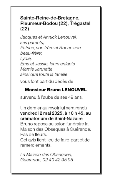Décédé à Sainte-Reine-de-Bretagne (44160) le mercredi 23 avril 2025 à l'âge de 48 ans