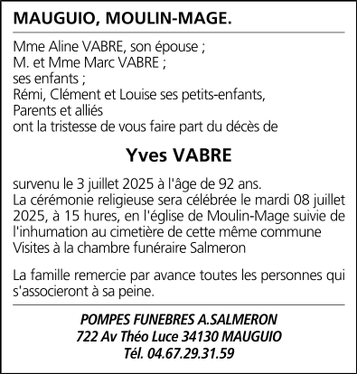 Décédé à Mauguio (34130) le jeudi 3 juillet 2025 à l'âge de 92 ans