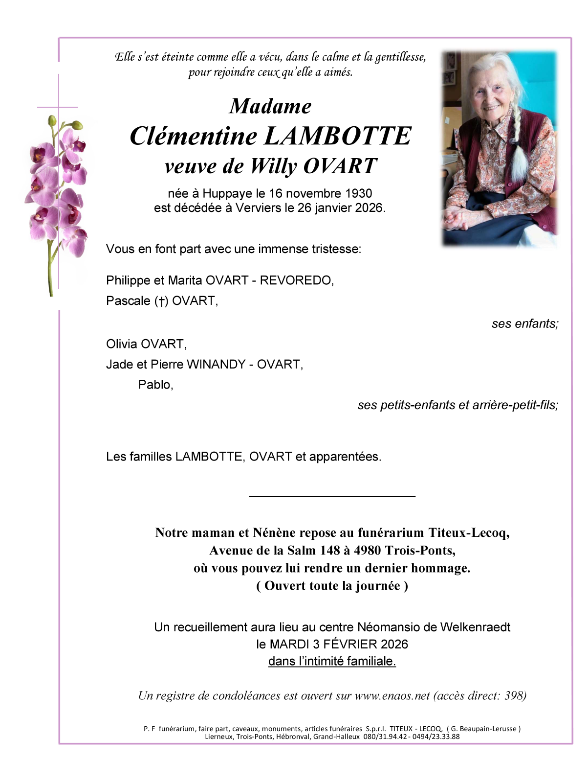 Décédée à Verviers (4800, Belgique) le lundi 26 janvier 2026 à l'âge de 95 ans