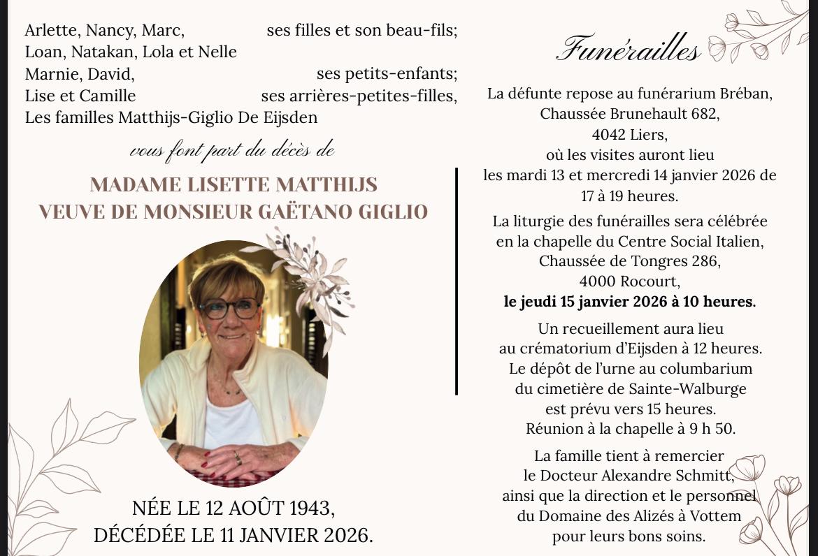 Décédée à Vottem (4041, Belgique) le dimanche 11 janvier 2026 à l'âge de 82 ans