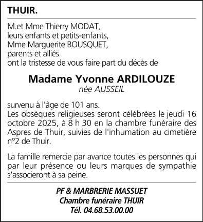 Died in Thuir (66300) on 14 October 2025 at the age of 101 years