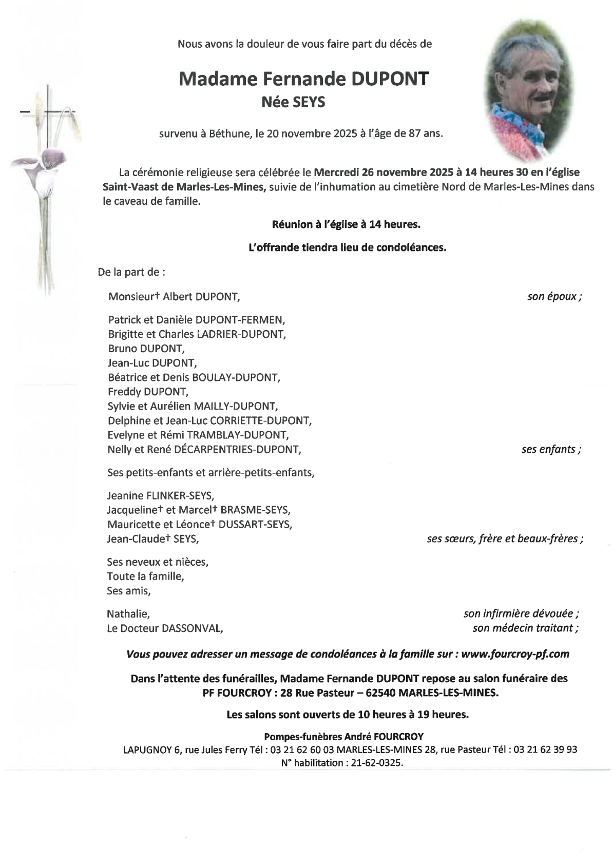 Décédée à Béthune (62400) le jeudi 20 novembre 2025 à l'âge de 87 ans