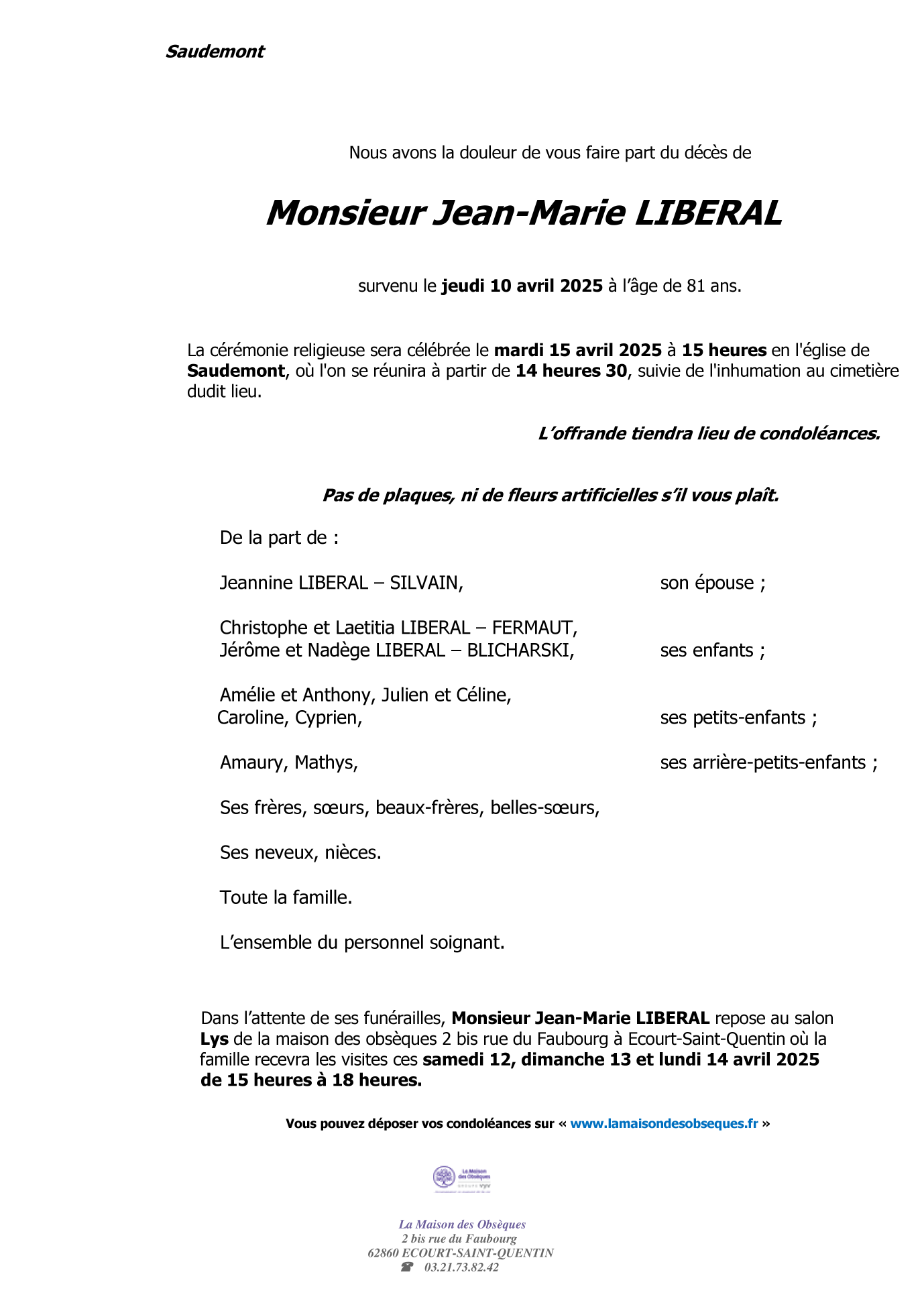 Overleden te Saudemont (62860) op donderdag 10 april 2025 op 81-jarige leeftijd