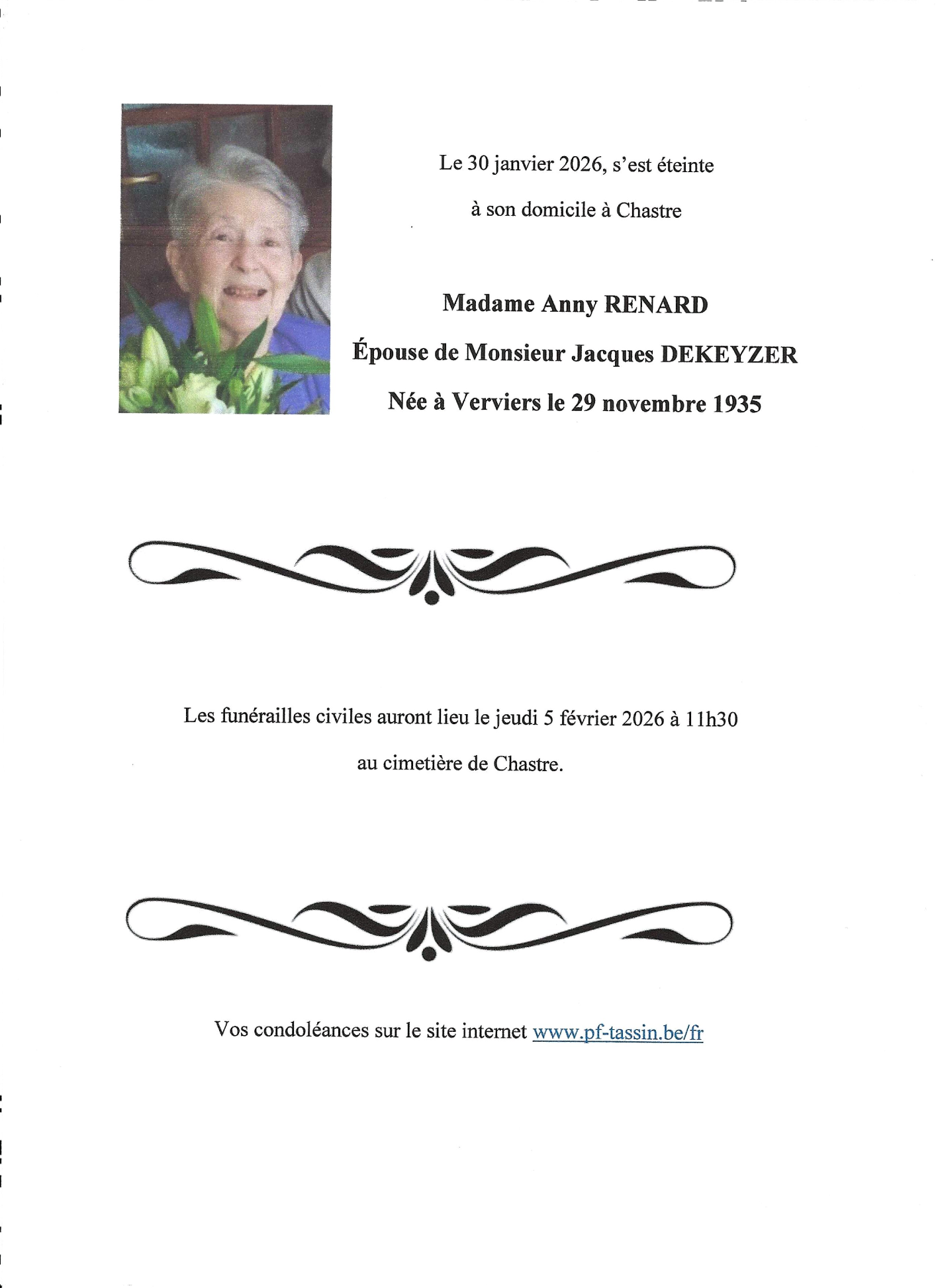Décédée à Chastre (1450, Belgique) le vendredi 30 janvier 2026 à l'âge de 90 ans
