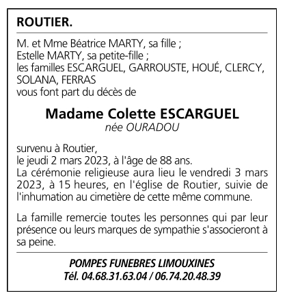 Died in Routier (11240) on 02 March 2023 at the age of 88 years