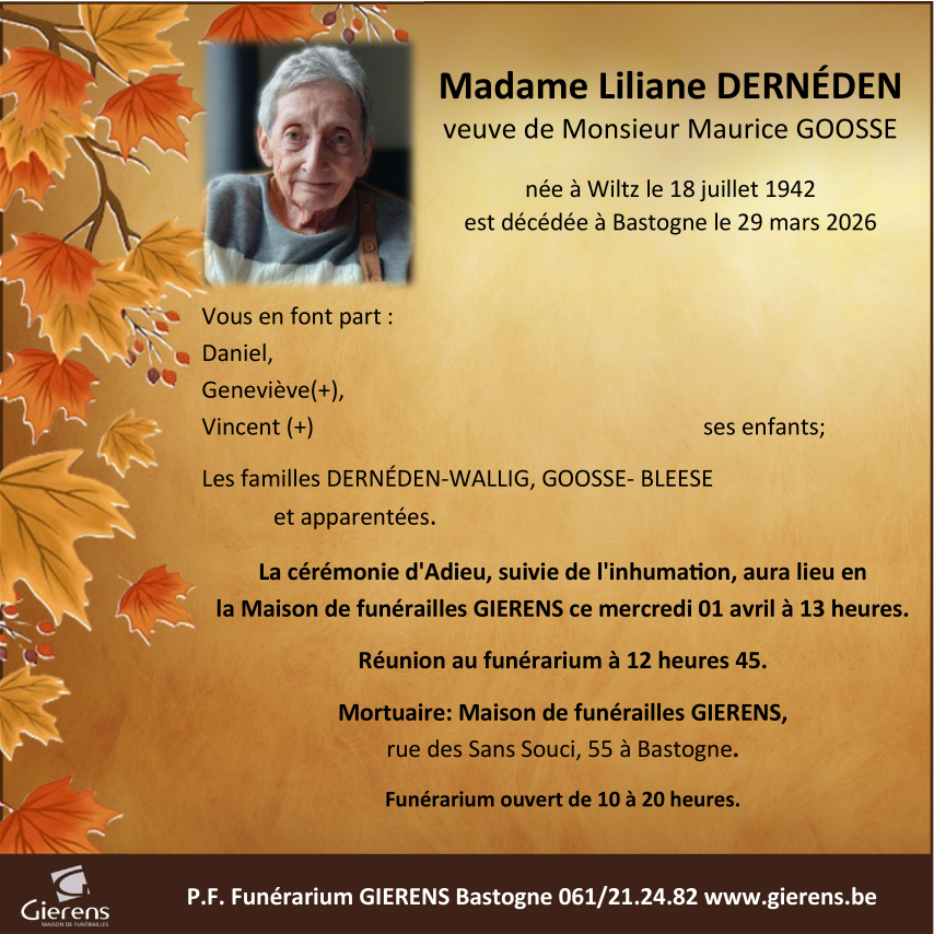 Décédée à Bastogne (6600, Belgique) le dimanche 29 mars 2026 à l'âge de 83 ans