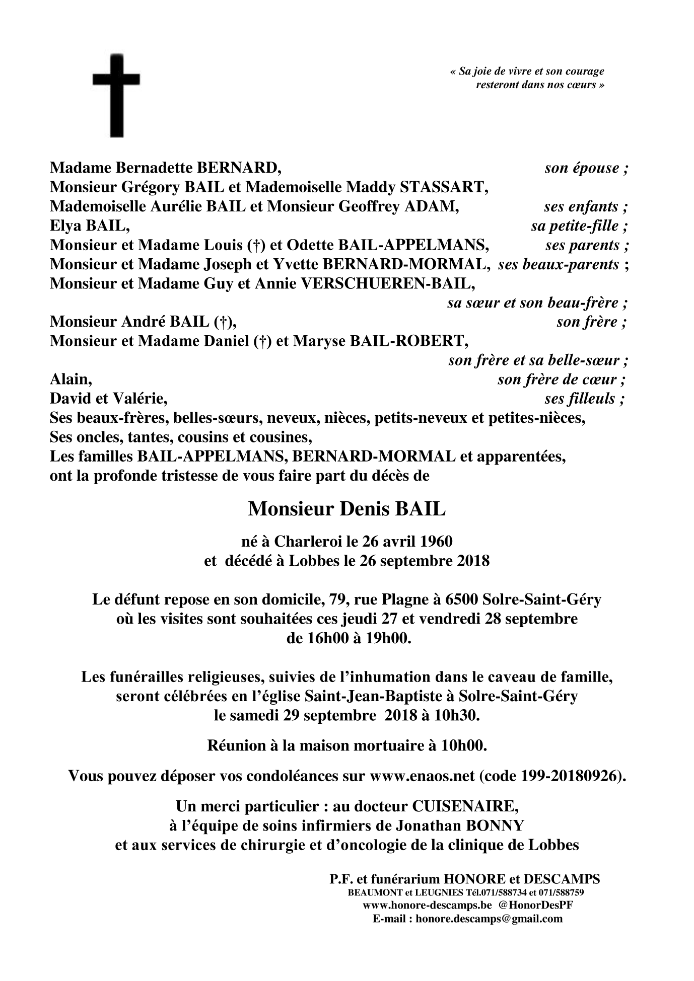 Overleden te Lobbes (6540, België) op woensdag 26 september 2018 op 58-jarige leeftijd