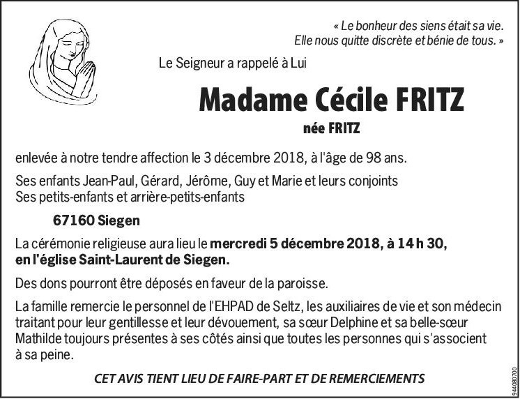 Décédée à Seltz (67470) le lundi 3 décembre 2018 à l'âge de 98 ans