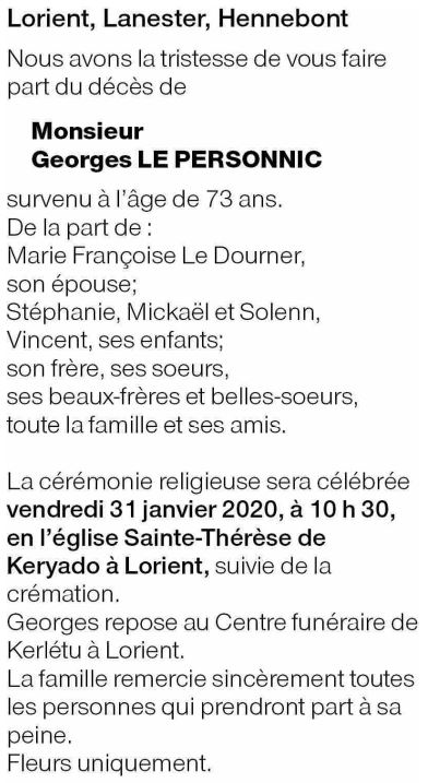 Décédé à Lorient (56100) le lundi 27 janvier 2020 à l'âge de 73 ans