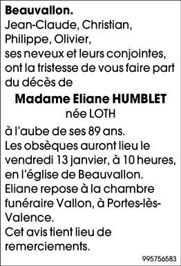 Décédée à Valence (26000) le mardi 10 janvier 2023 à l'âge de 88 ans