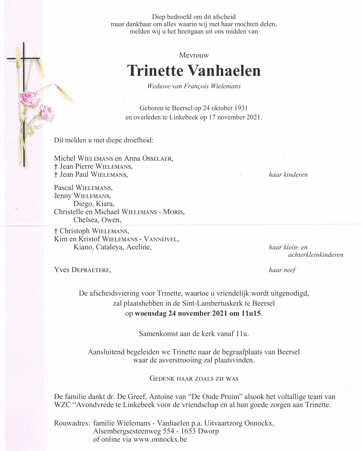 Décédée à Linkebeek (1630, Belgique) le mercredi 17 novembre 2021 à l'âge de 90 ans