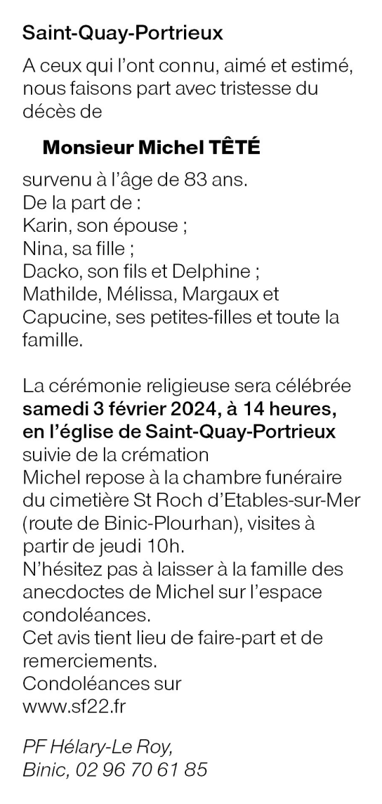 Décédé à Saint-Brieuc (22000) le samedi 27 janvier 2024 à l'âge de 83 ans