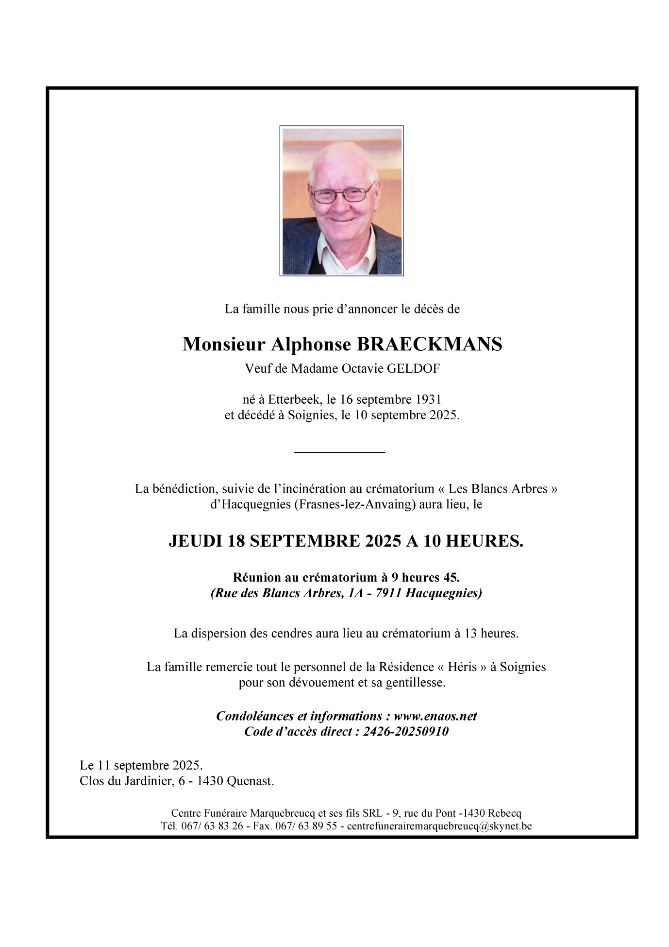 Décédé à Soignies (7060, Belgique) le mercredi 10 septembre 2025 à l'âge de 93 ans