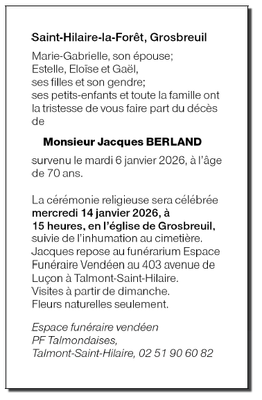 Overleden te Talmont-Saint-Hilaire (85440) op dinsdag 6 januari 2026 op 70-jarige leeftijd