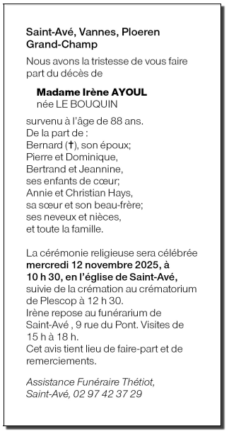 Fallecida en Saint-Avé (56890) el miércoles, 5 de noviembre de 2025 a la edad de 88 años