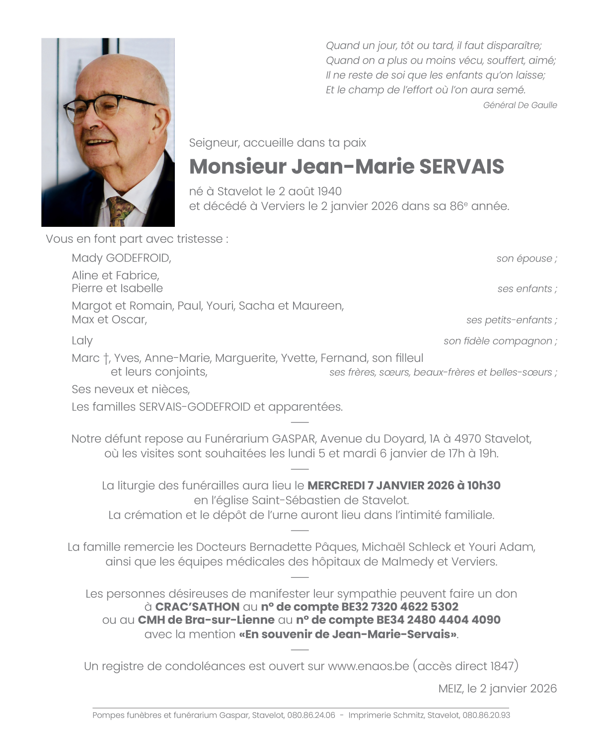 Décédé à Verviers (4800, Belgique) le vendredi 2 janvier 2026 à l'âge de 85 ans