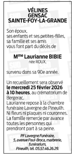 Décédée à Vélines (24230) le mardi 17 février 2026 à l'âge de 89 ans