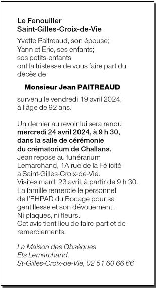 Décédé à Saint-Gilles-Croix-de-Vie (85800) le vendredi 19 avril 2024 à l'âge de 92 ans