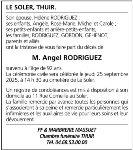 Décédé à Le Soler (66270) le mardi 23 septembre 2025 à l'âge de 92 ans