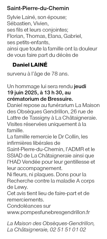 Décédé à Saint-Pierre-du-Chemin (85120) le samedi 14 juin 2025 à l'âge de 78 ans