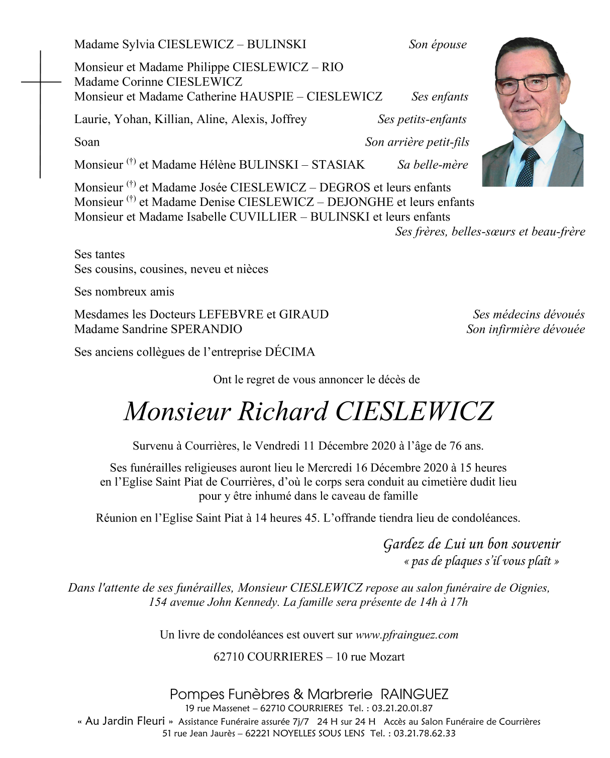 Décédé à Courrières (62710) le vendredi 11 décembre 2020 à l'âge de 76 ans