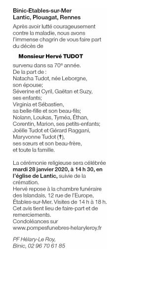 Décédé à Plérin (22190) le samedi 25 janvier 2020 à l'âge de 69 ans