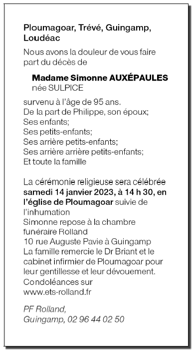Décédée à Ploumagoar (22970) le jeudi 12 janvier 2023 à l'âge de 95 ans