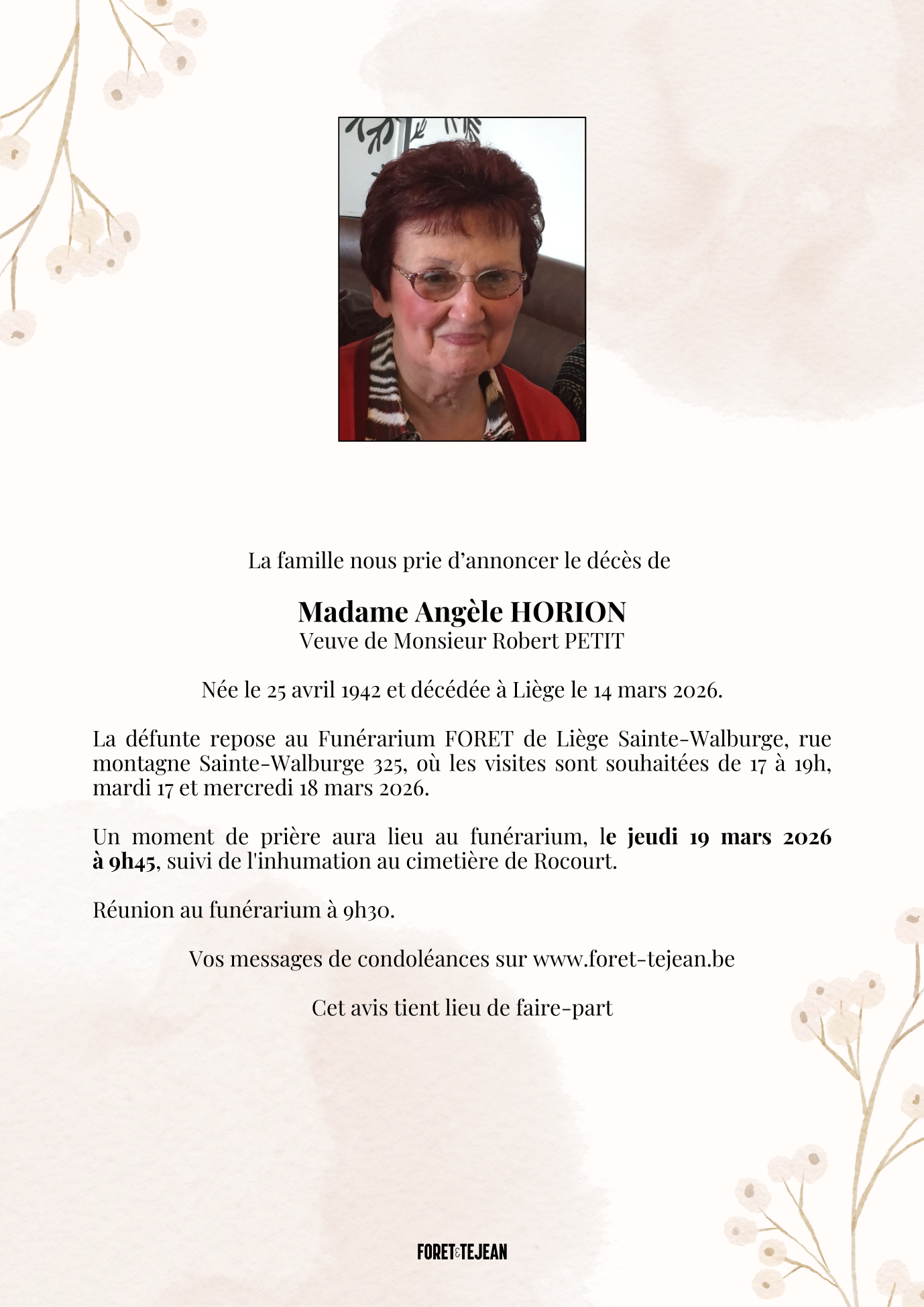 Décédée à Liège (4000, Belgique) le samedi 14 mars 2026 à l'âge de 83 ans