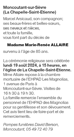 Décédée à Moncoutant-sur-Sèvre (79320) le jeudi 15 août 2024 à l'âge de 85 ans