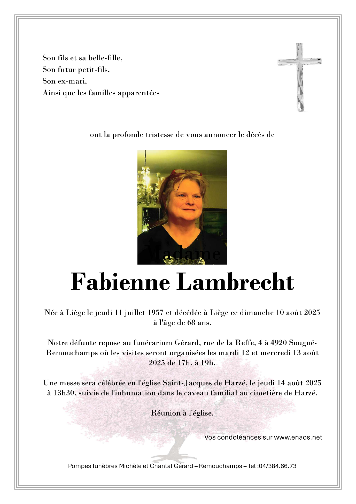Décédée à Liège (4000, Belgique) le dimanche 10 août 2025 à l'âge de 68 ans