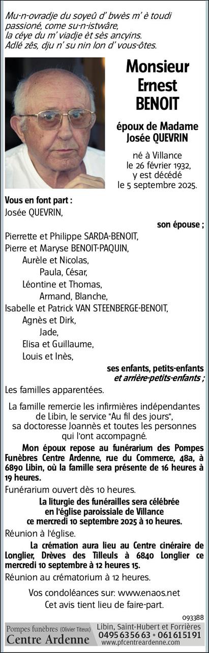 Décédé à Villance (6890, Belgique) le vendredi 5 septembre 2025 à l'âge de 93 ans