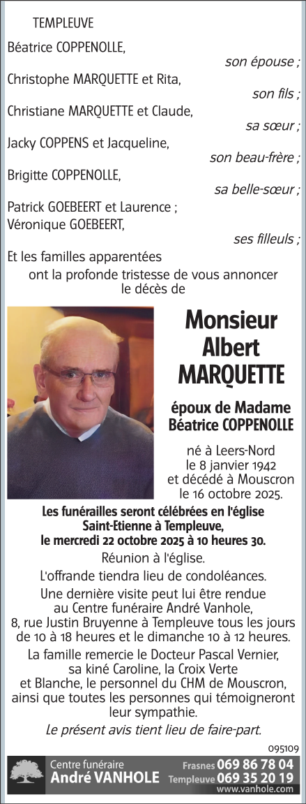 Overleden te Mouscron (7700, België) op donderdag 16 oktober 2025 op 83-jarige leeftijd