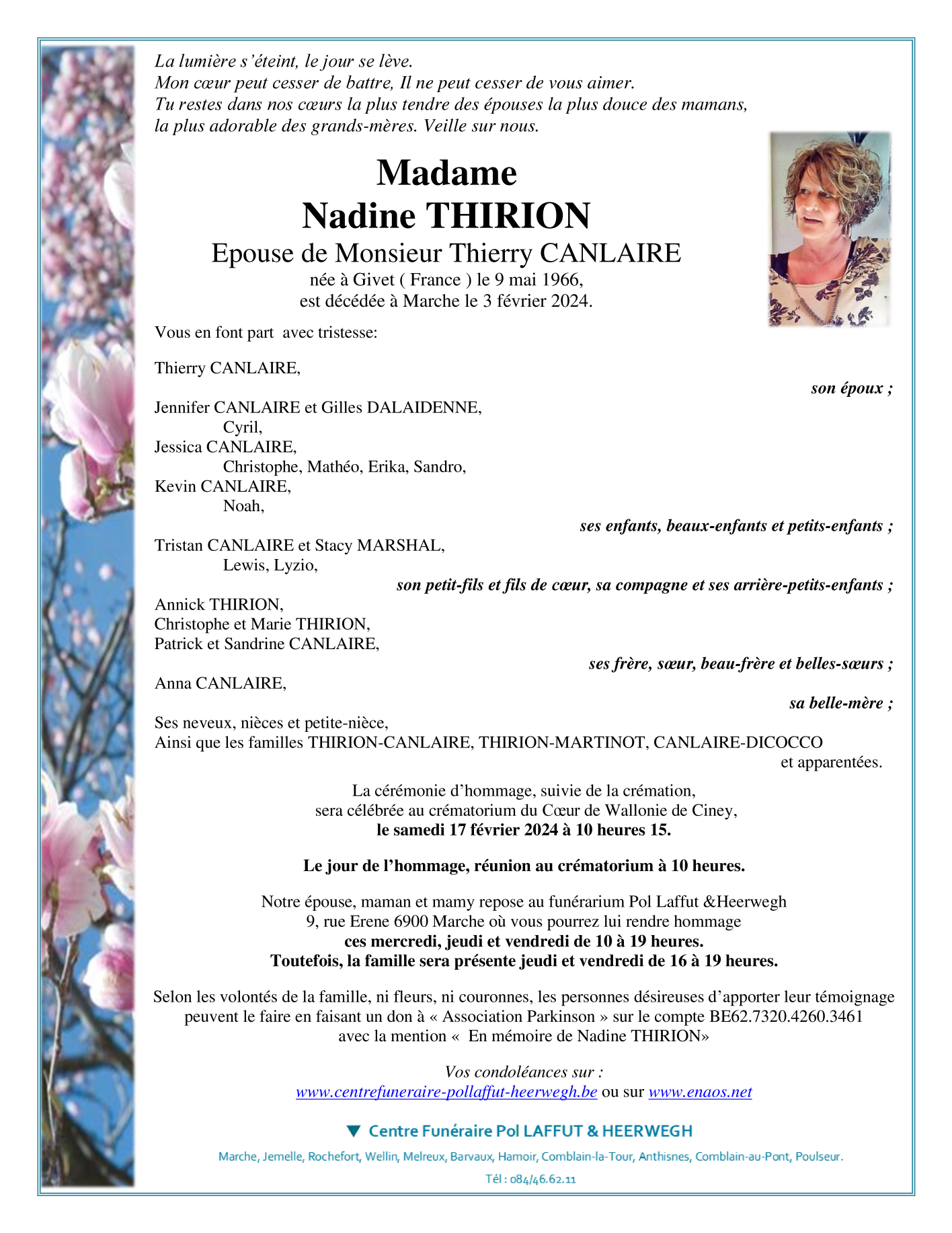 Overleden te Marche-en-Famenne (6900, België) op dinsdag 13 februari 2024 op 57-jarige leeftijd