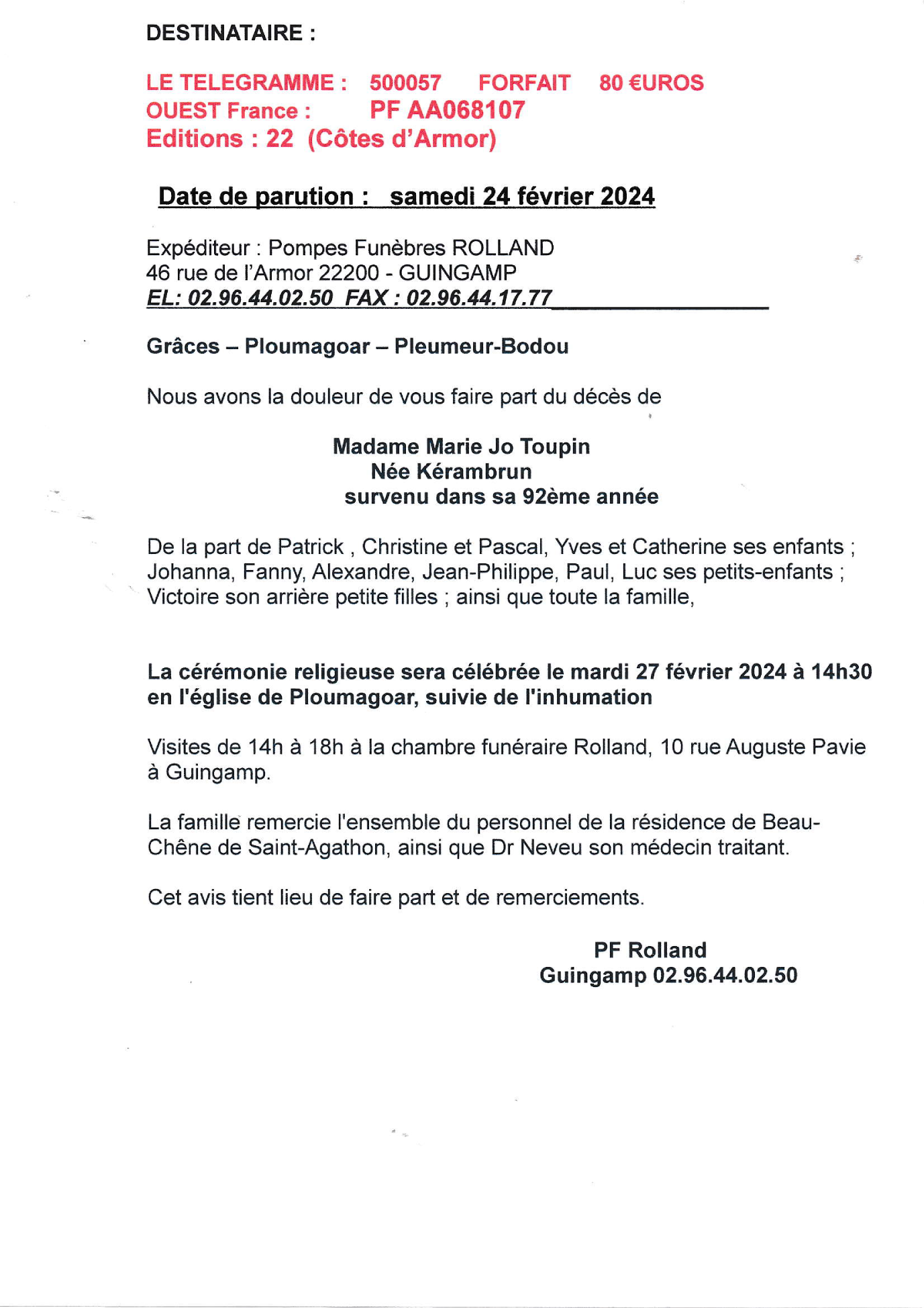 Décédée à Saint-Brieuc (22000) le vendredi 23 février 2024 à l'âge de 91 ans