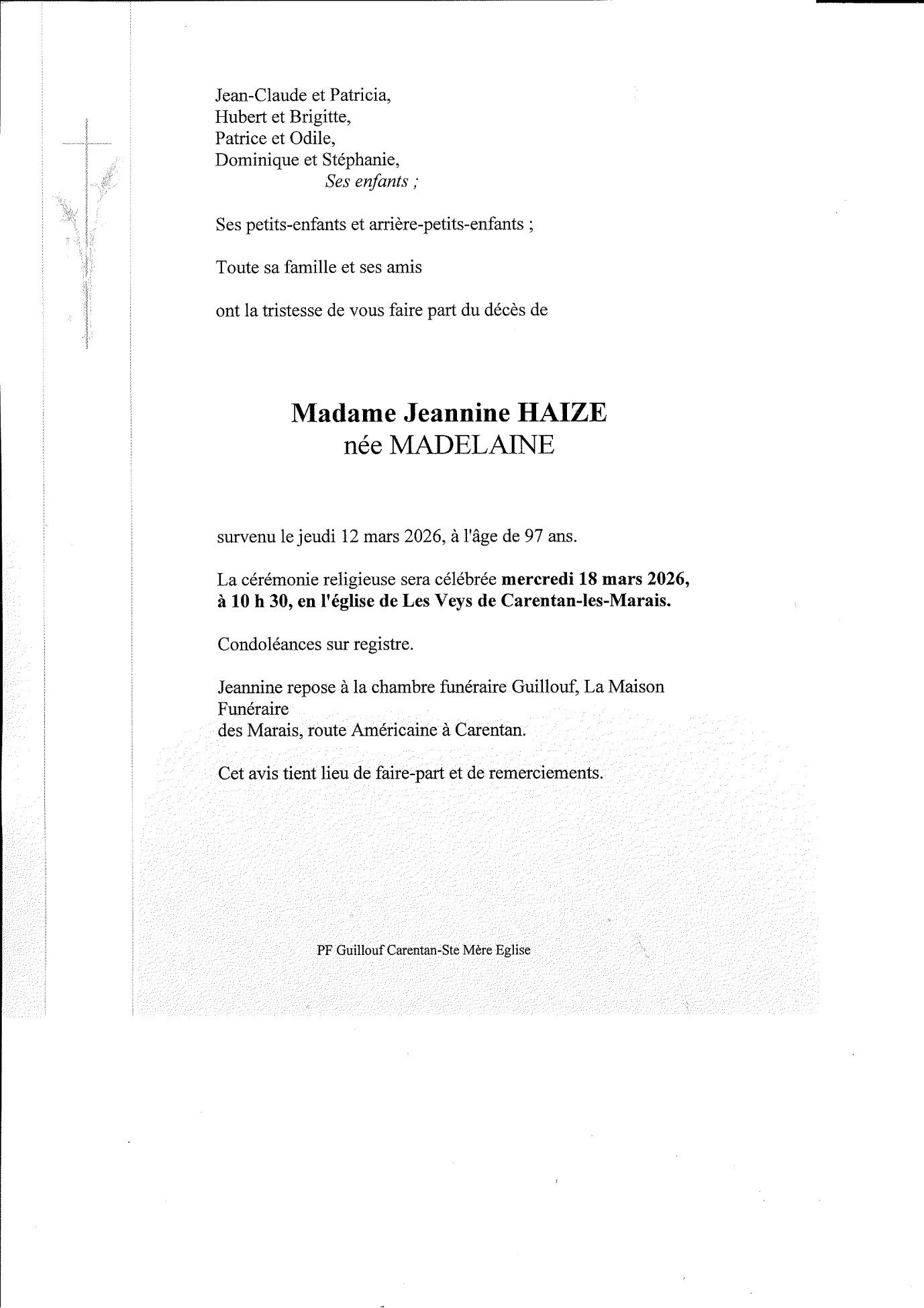 Décédée à Carentan-les-Marais (50500) le jeudi 12 mars 2026 à l'âge de 97 ans