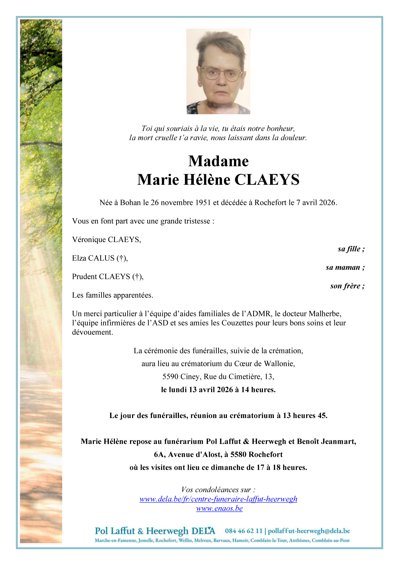 Décédée à Rochefort (5580, Belgique) le mardi 7 avril 2026 à l'âge de 74 ans