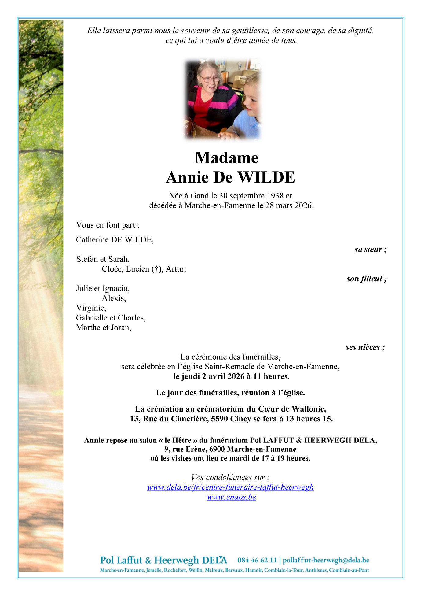 Fallecida en Marche-en-Famenne (6900, Bélgica) el sábado, 28 de marzo de 2026 a la edad de 87 años